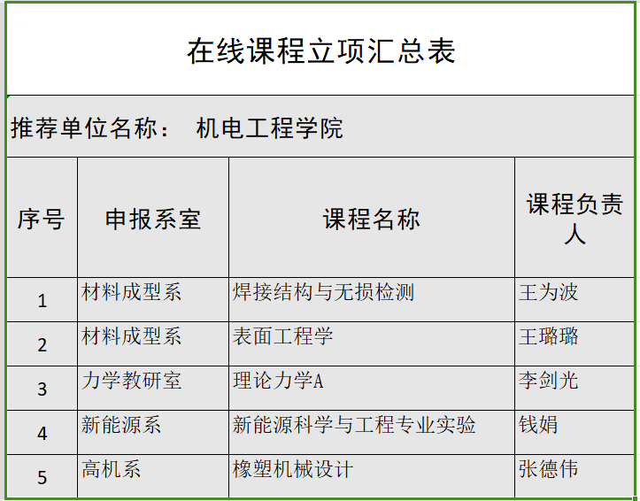 根据《关于推进学院省在线课程增量建设的通知》和《机电工程学院2024-2027聘期高水平教学业绩资助办法》,学院组织各专业申报新建在线课程,共有5门课程提交材料,经评委评审,现拟对以下5门课程进行立项,所有立项课程负责人需在规定时间,达成规定建设目标,特此公示。公示期三天(2024年7月22日-7月24日),如有异议,请在公示期内向机电工程学院教学办反映。
