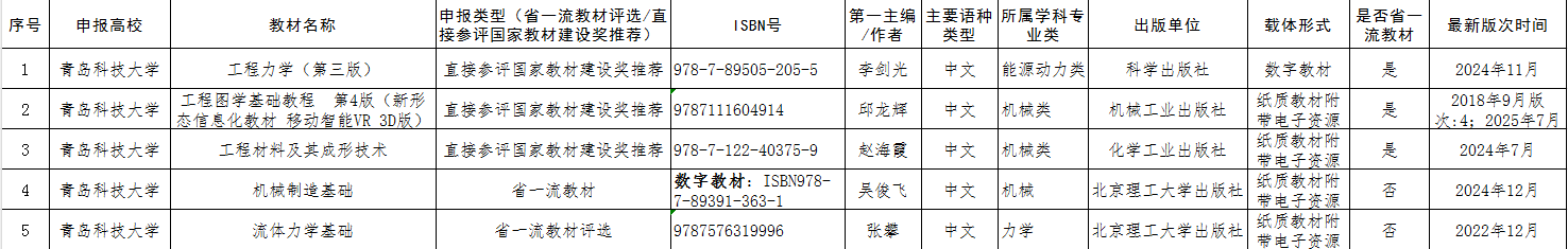 根据学校《关于开展第三批山东省高等教育一流教材和第二届全国教材建设奖评选推荐工作的通知》,经个人申报,学院初审,同意以下教材申报并推荐至学校,参加进一步遴选(排名不分先后),特此公示。。公示期三天(2025年7月3日-7月5日),如有异议,请在公示期内向机电工程学院教学办反映