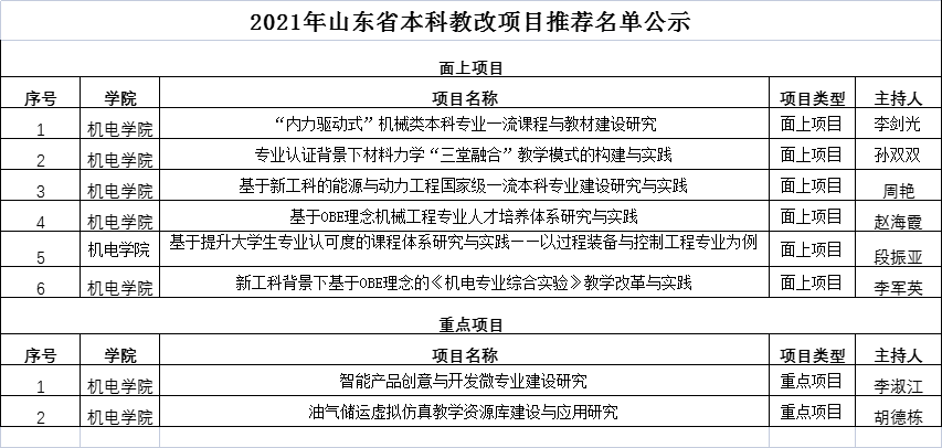 根据学校《关于组织开展2021年山东省本科教学改革研究项目立项及管理工作的通知》要求,beat365官方网站开展了省级教改项目评审工作,经项目负责人申报,学院评审,共推荐新立项8项,现将结果公示如下: