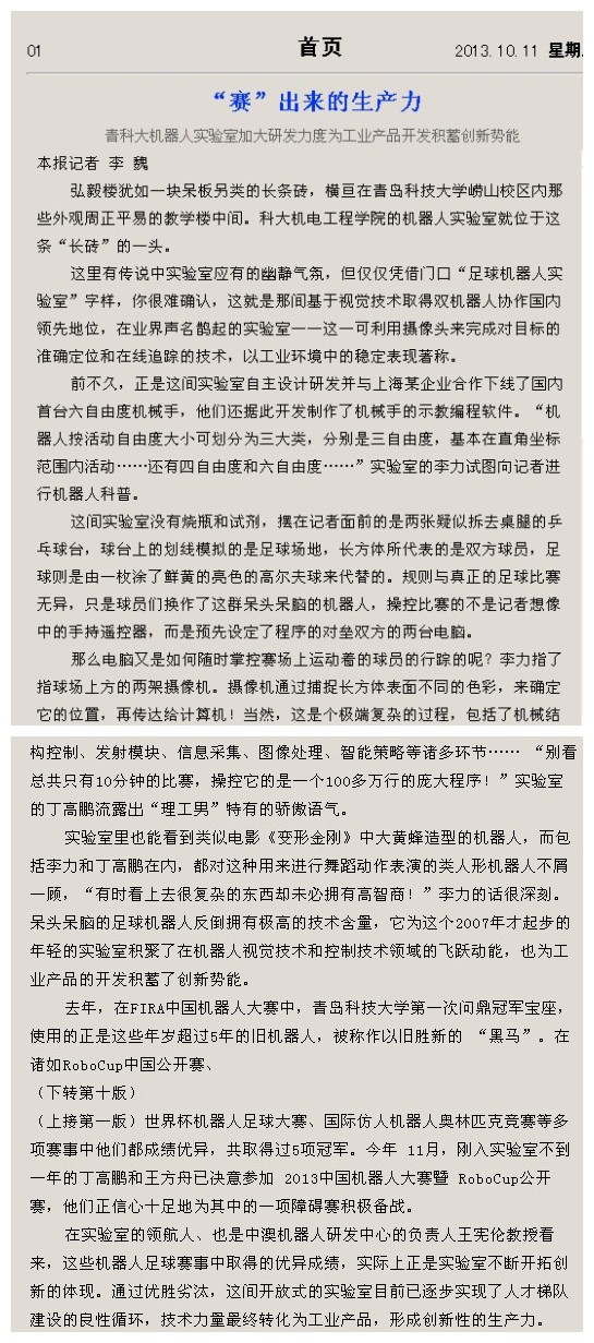 【青岛日报】青科大机器人实验室加大研发力度为工业产品开发积蓄创新势能(头版头条)