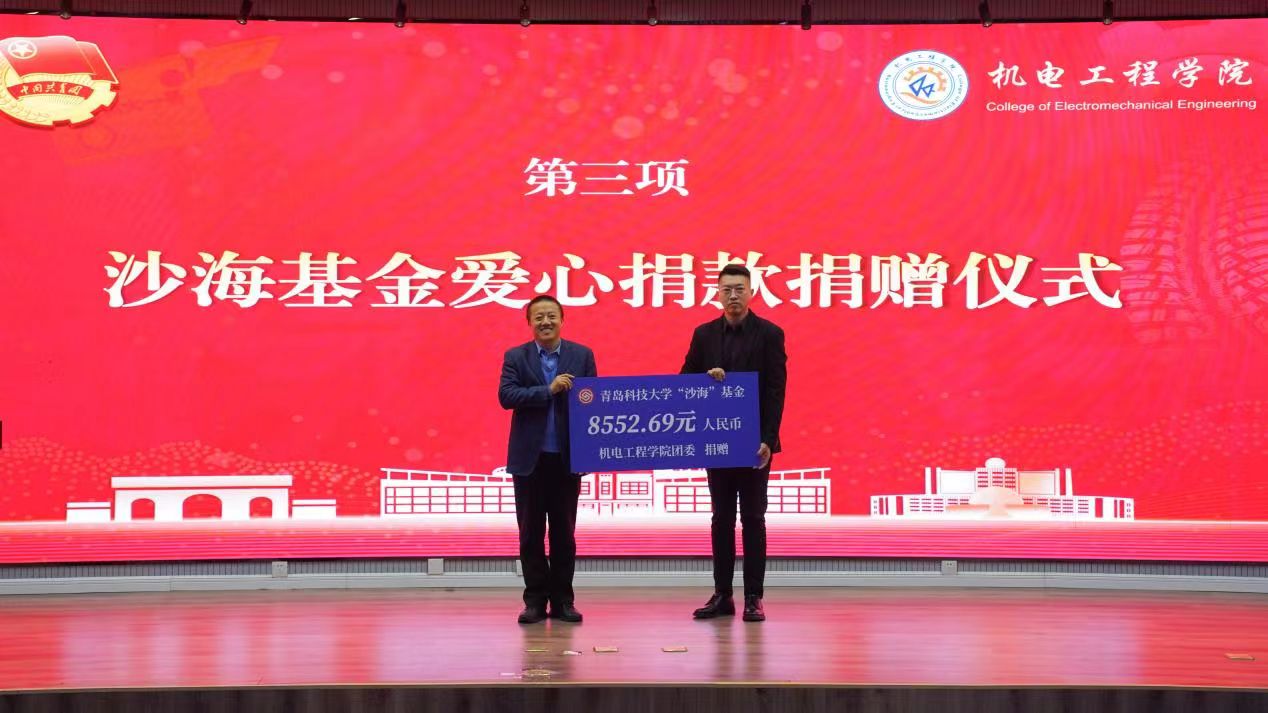 “沙海基金”爱心捐款捐赠仪式环节,由院党委副书记兼副院长杨小明代表学院向校团委副书记李航进行捐赠。青岛科技大学沙海基金成立于2014年,为支教服务地的教育事业发展和研究生支教团工作提供了重要保障。在沙海助学专项活动中,机电工程学院的老师和同学们用自己的实际行动支援西部建设,为西部乡村教育事业发展贡献自己的力量,推动西部教育事业蓬勃发展。