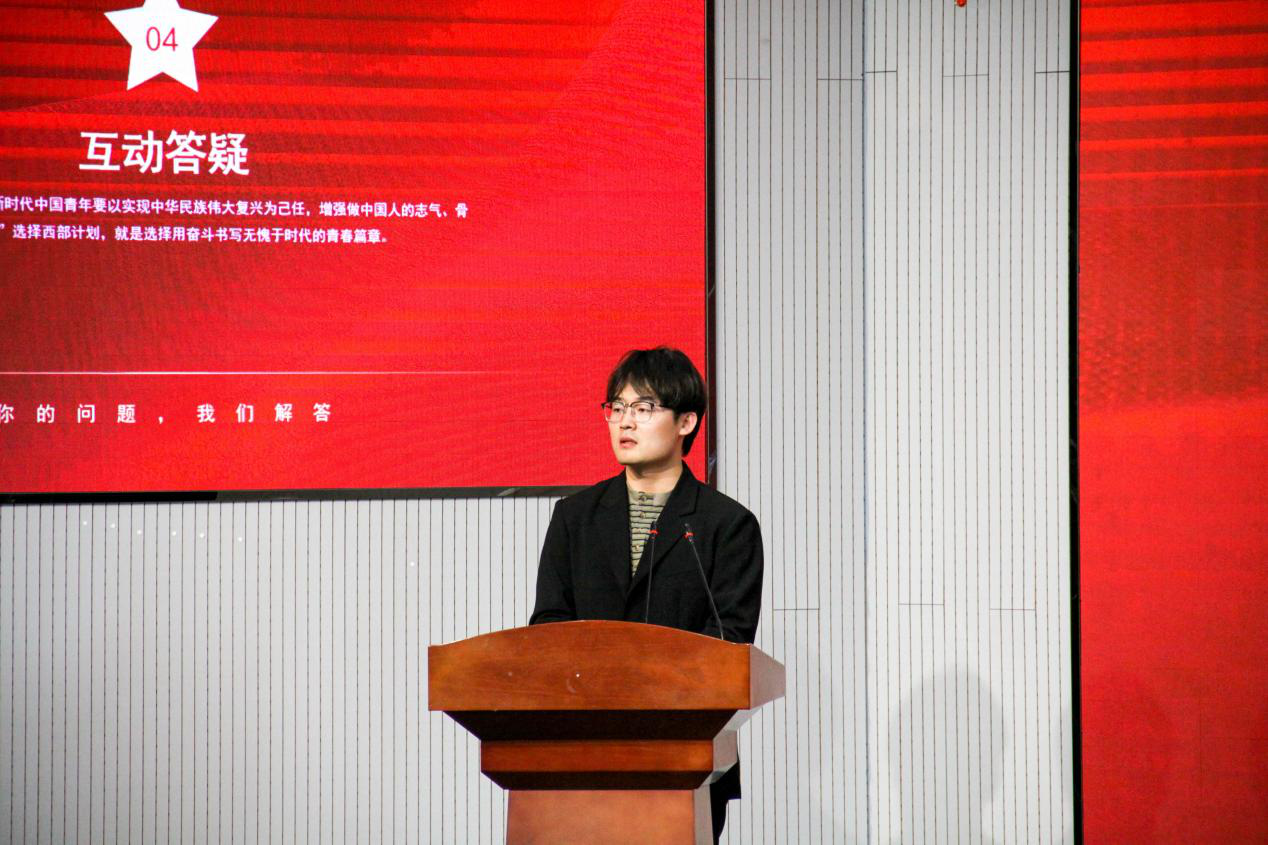 全国大学生志愿服务西部计划优秀志愿者、机电工程学院2011届毕业生刘猛回顾了自己在西部志愿服务期间的成长与收获,强调了西部计划对个人成长和社会贡献的双重意义。学院团委书记兼学工办主任逄柏鹏详细介绍了西部计划的具体情况,包括报名流程、服务内容、政策支持等信息。青岛科技大学第24届研究生支教团银川分队成员耿宇轩分享了自己在西部支教期间的经历与感悟。