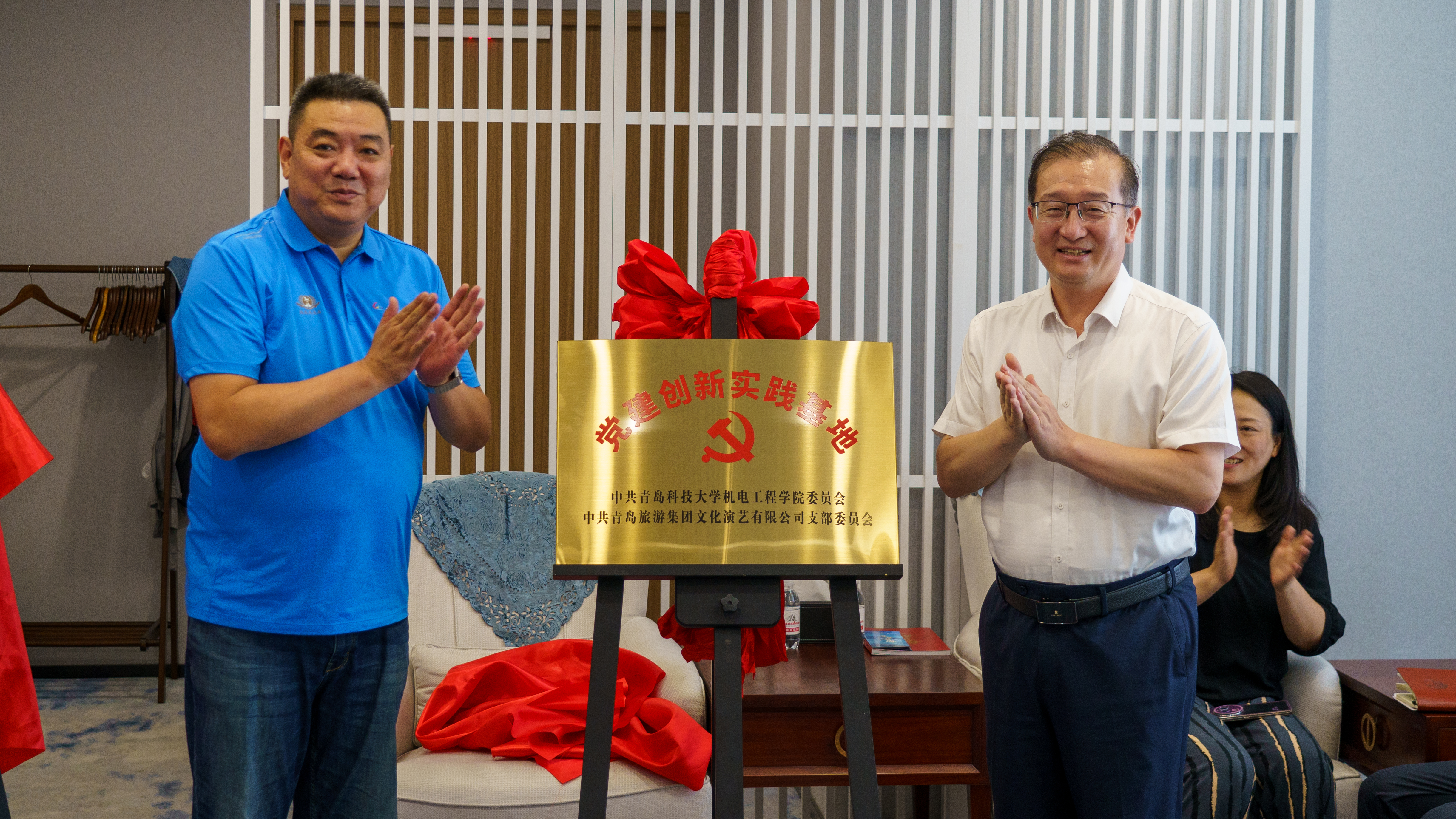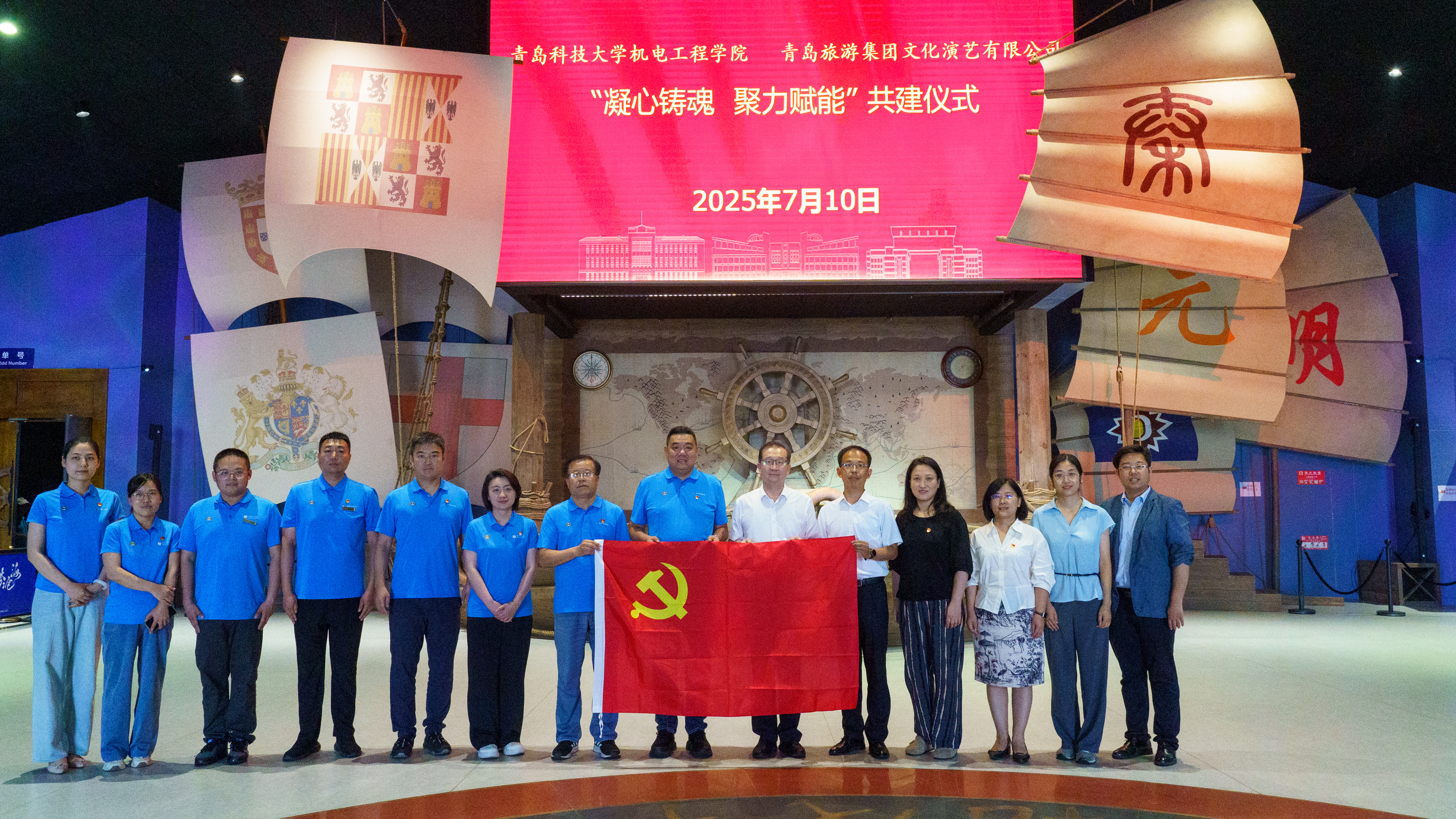 7 月 10 日下午,机电工程学院与青岛旅游集团文化演艺有限公司在青岛奥帆中心海上剧场开展共建交流活动。青岛旅游集团文化演艺有限公司总经理韩刚、副总经理孙恬等相关领导,机电工程学院党委书记任允晓、团委书记兼学工办主任逄柏鹏、师生党员代表10人参加活动。