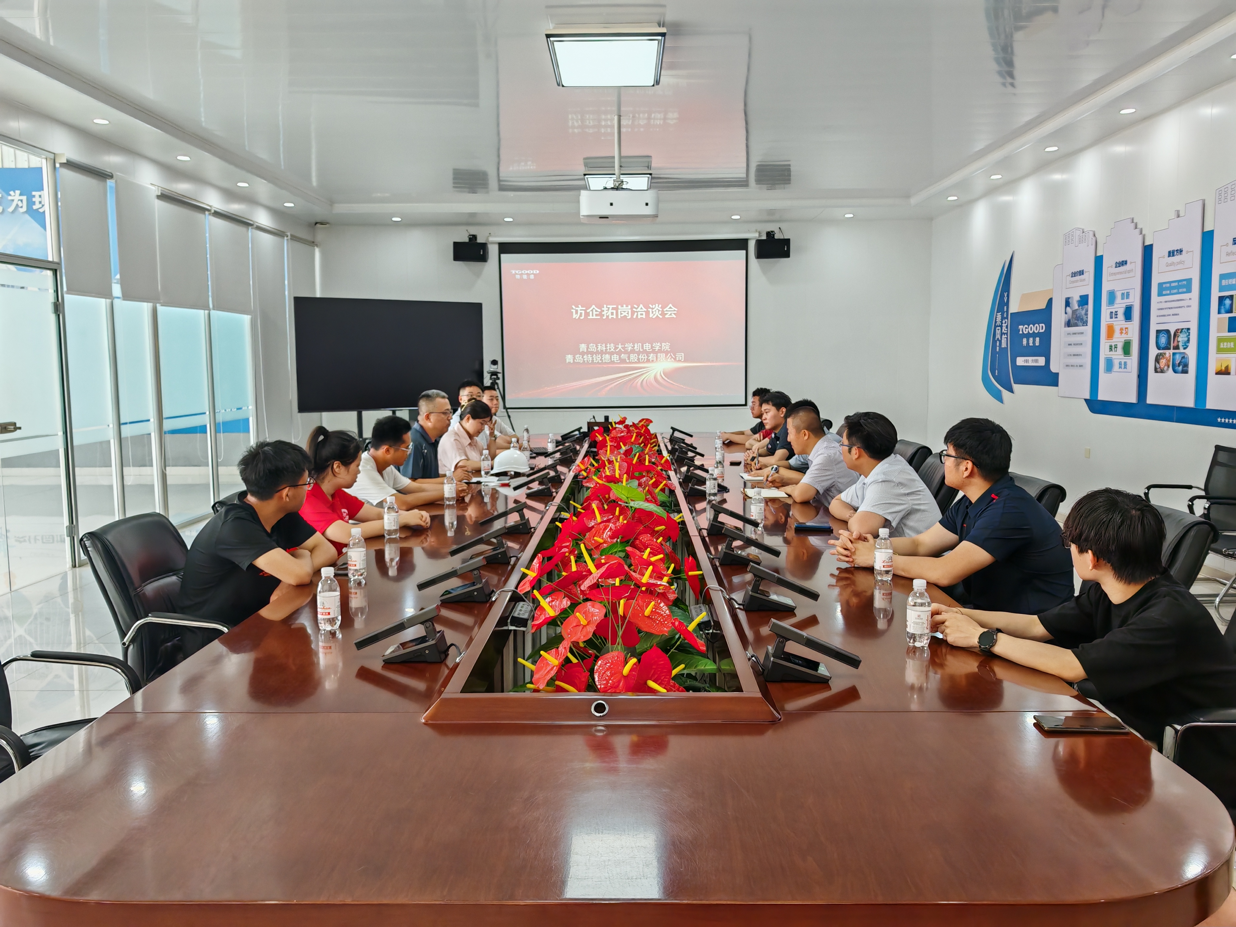 7月11日,机电工程学院党委副书记兼副院长杨小明一行15人赴青岛特锐德电气股份有限公司胶州生产基地开展访企拓岗。特锐德电气股份有限公司技术数智化标准副总工程师王贵罡、人力资源中心总经理助理焦雪莹、人力资源中心校园招聘负责人董琛陪同调研,学院8名2026届毕业生参加活动。