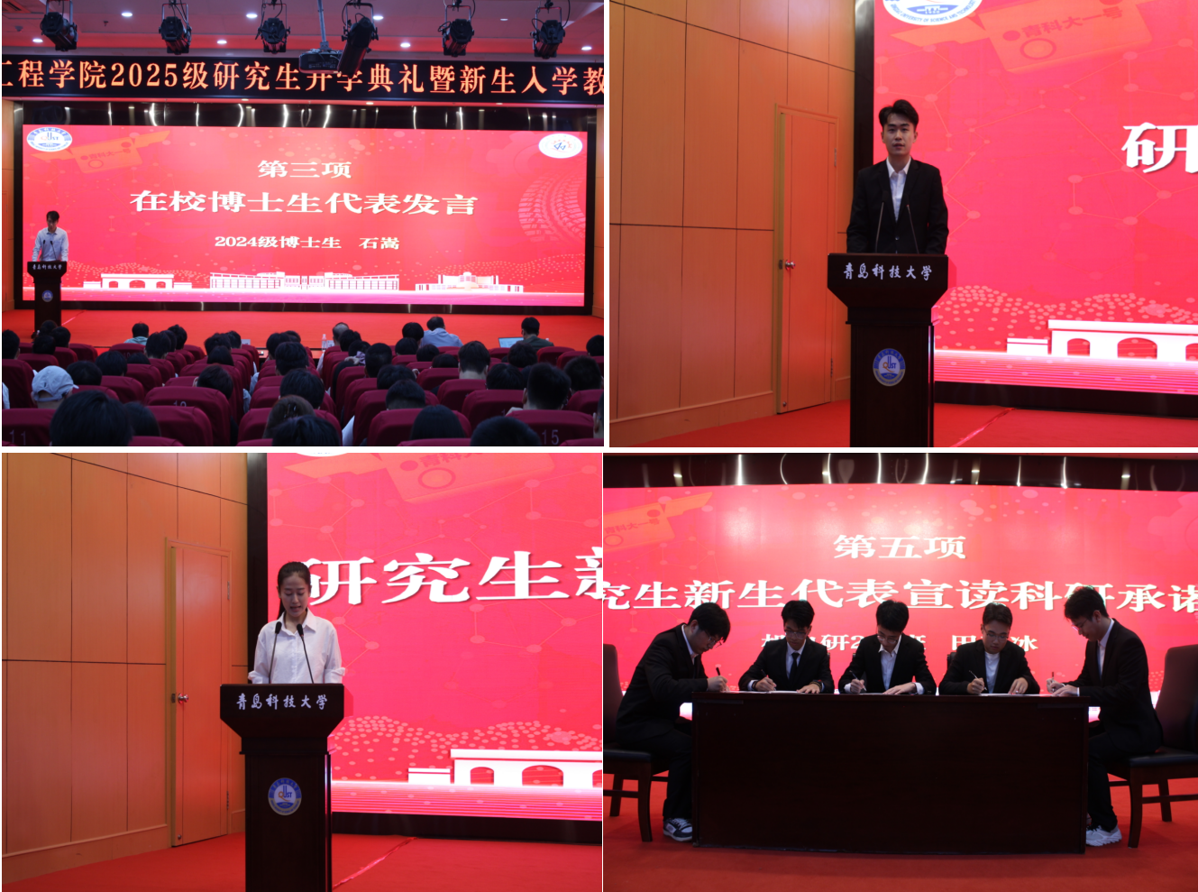 在校生代表2024级博士生石嵩、2025级研究生新生代表袁俊杰分别结合自身经历发言,分享科研心得与求学志向。会上,2025级研究生代表郑重签署了《学术道德规范承诺书》,承诺恪守学术规范、坚守科研诚信。与会研究生集体观看了《我们对科学的误解》视频,进一步感受学术氛围和提升思辨意识。