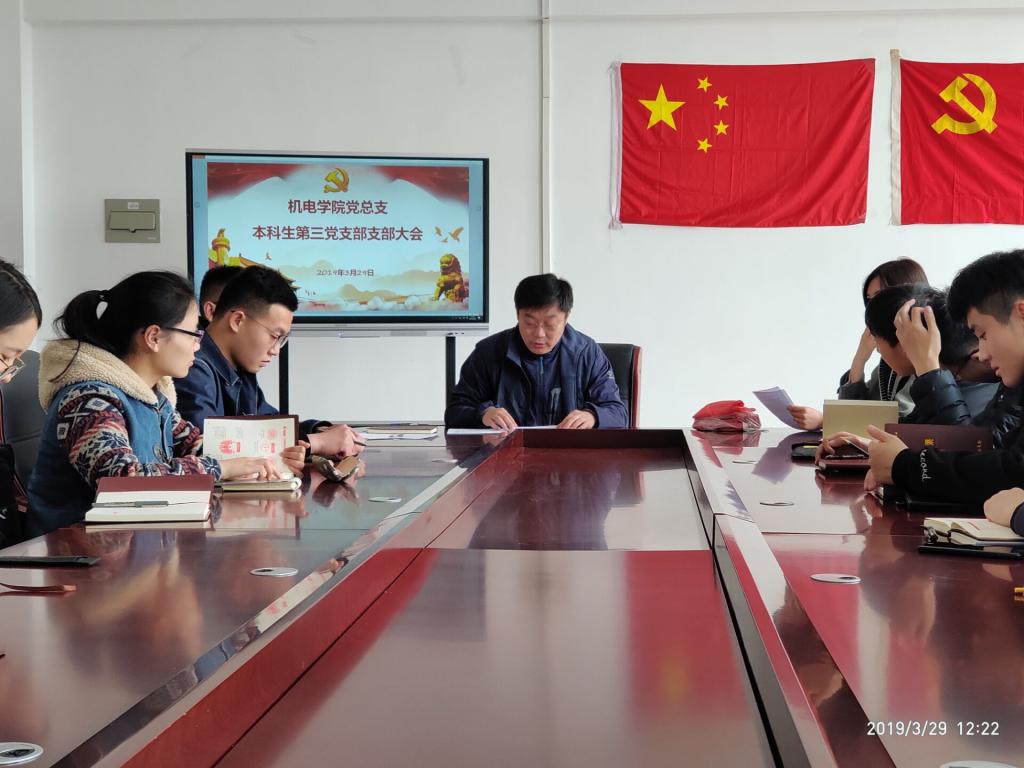 为了坚持和加强党的全面领导,全面提升党支部组织力,强化党支部政治功能,充分发挥党支部战斗堡垒作用,根据《中国共产党支部工作条例》和有关党内法规,3月29日,机电工程学院本科生第三党支部在518会议室召开党员大会。
