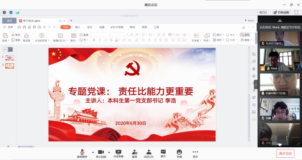 为贯彻落实全国全省基层党建工作重点任务推进会精神,根据中组部“党课开讲啦”活动安排、省委组织部和学校有关通知要求,按照学校《关于开展“我来讲党课”活动的通知》部署,6月30日下午,机电工程学院本科生第一党支部书记李浩在腾讯会议主讲“迎七一”专题党课。全体学生党员参加党课学习,会议由王玉凯老师主持。