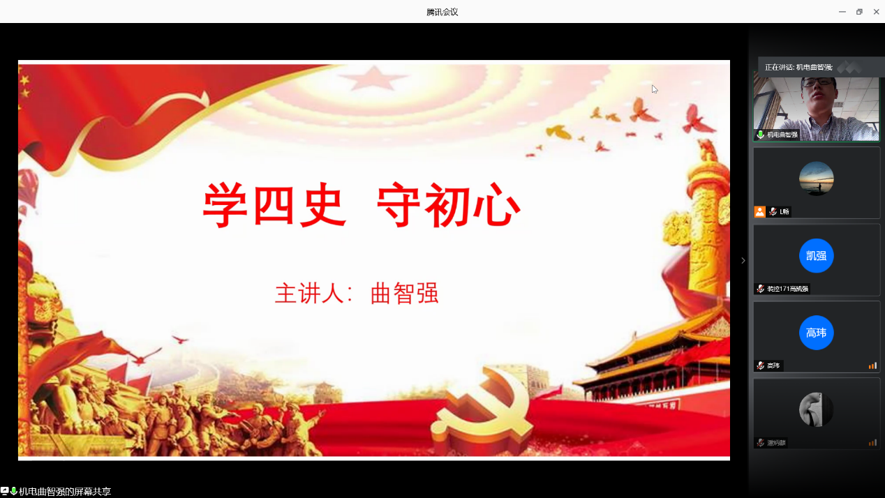 党支部书记曲智强以“学四史,守初心”为主题为全体党员上党课,要求党员同志要从历史汲取力量,保持锐意进取的精神状态,同时找差距,正视差距,永葆共产党人的初心。全体党员同志要认真学习四史,强调中国共产党的历史是一部实践史,也只有共产党才能救中国。以人生选择和学习强国积分为例,指出对于学生党员要有大格局,同时列举表率,树立榜样。