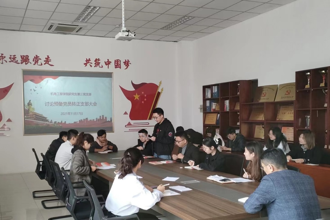 11月17日上午,机电工程学院研究生第三党支部在机电楼529会议室召开预备党员转正大会,支部党员除一人请假外其他人员参加会议,会议由宗萌主持。