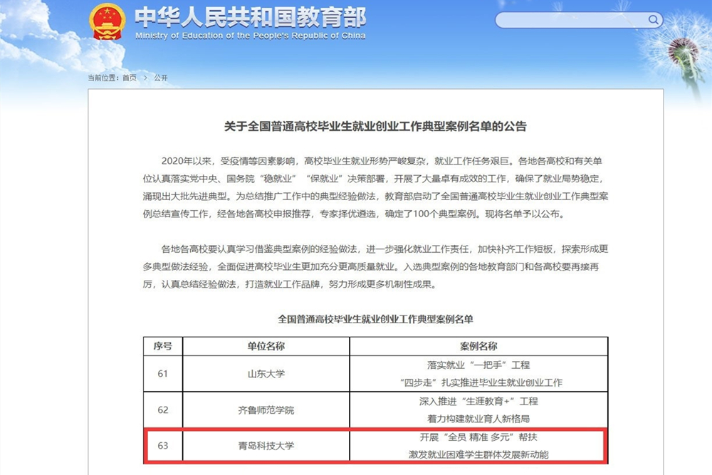 11月26日,教育部发布了《全国普通高校毕业生就业创业工作典型案例名单的公告》,我校案例《开展“全员 精准 多元”帮扶 激发就业困难学生群体发展新动能》成功入选。本次评选,全国共100个典型案例入选,入选单位包括北京市教育委员会、江苏省教育厅等5家省级教育主管部门,北京大学、清华大学等36所部属高校,29所省属本科高校和30所高职高专院校。多年来,学校全面贯彻落实立德树人的根本任务,坚持以学生为中心,聚焦“就业困难学生群体”,精准发力,暖心帮扶,不断丰富“一体两翼三化”就业创业工作模式内涵,构建针对就业困难学生的精准就业服务支持系统,通过“一把手工程”与制度支撑相结合,实现全员帮扶,“就创业工程”与拓展岗位相结合,实现精准帮扶,“惠民生工程”与提升技能相结合,实现多元帮扶,激发就业困难学生群体发展新动能,持续提升学生获得感和幸福感。