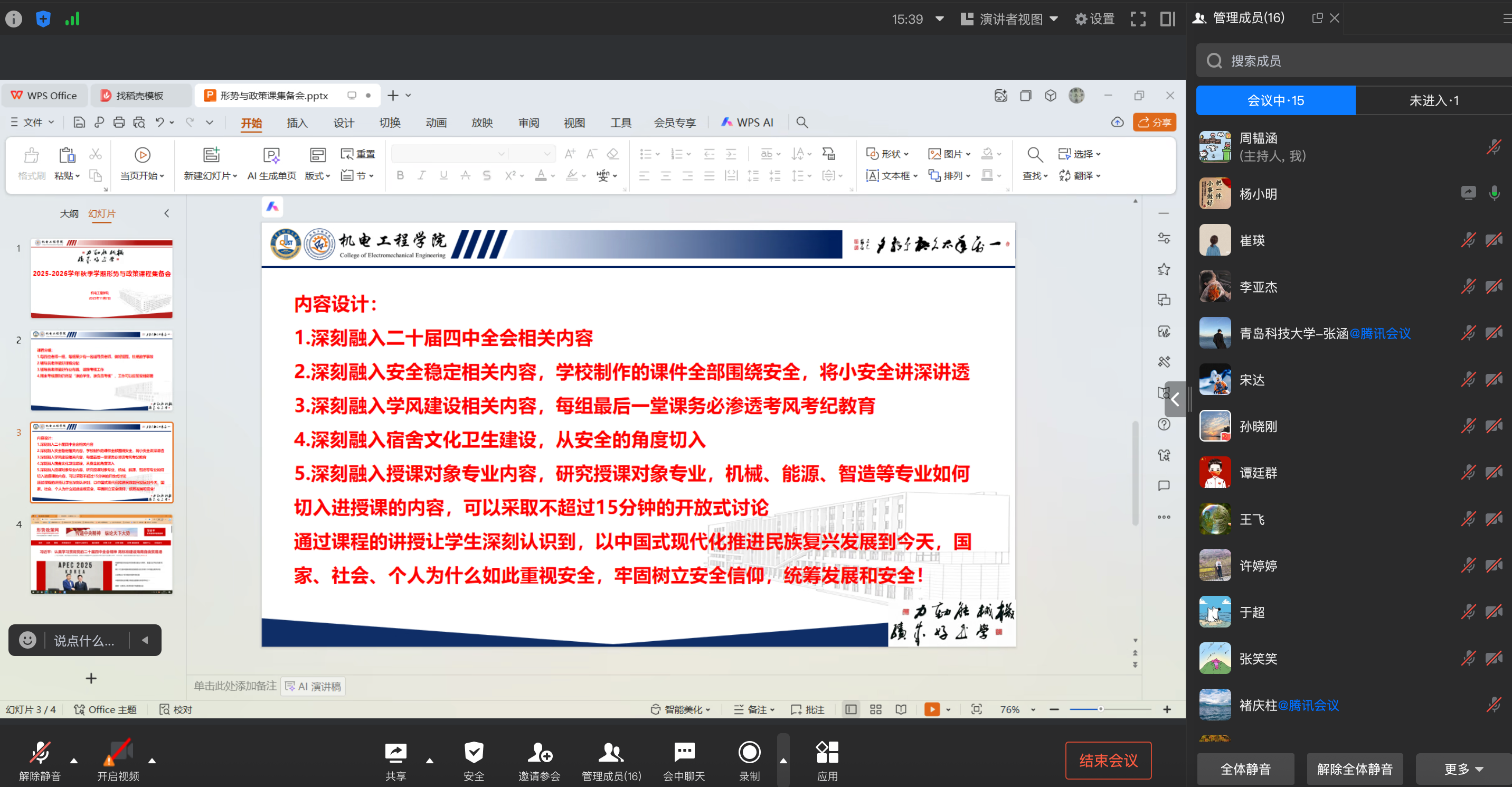 本学期课程聚焦五个专题开展教学:深入学习贯彻党的二十届四中全会精神、聚焦建设更高水平平安中国、践行多边主义完善全球治理、携手周边国家共创美好未来、阔步迈向农业强国。会议强调,各授课组要做好专题内容分配,注重教学组织与过程管理,坚决杜绝教学事故。在内容设计上,要求课程设计应考虑将安全稳定教育、学风建设、宿舍文化、考风考纪以及学生专业背景有机融入教学全过程,推动课程内容与学生成长、国家发展深度融合。