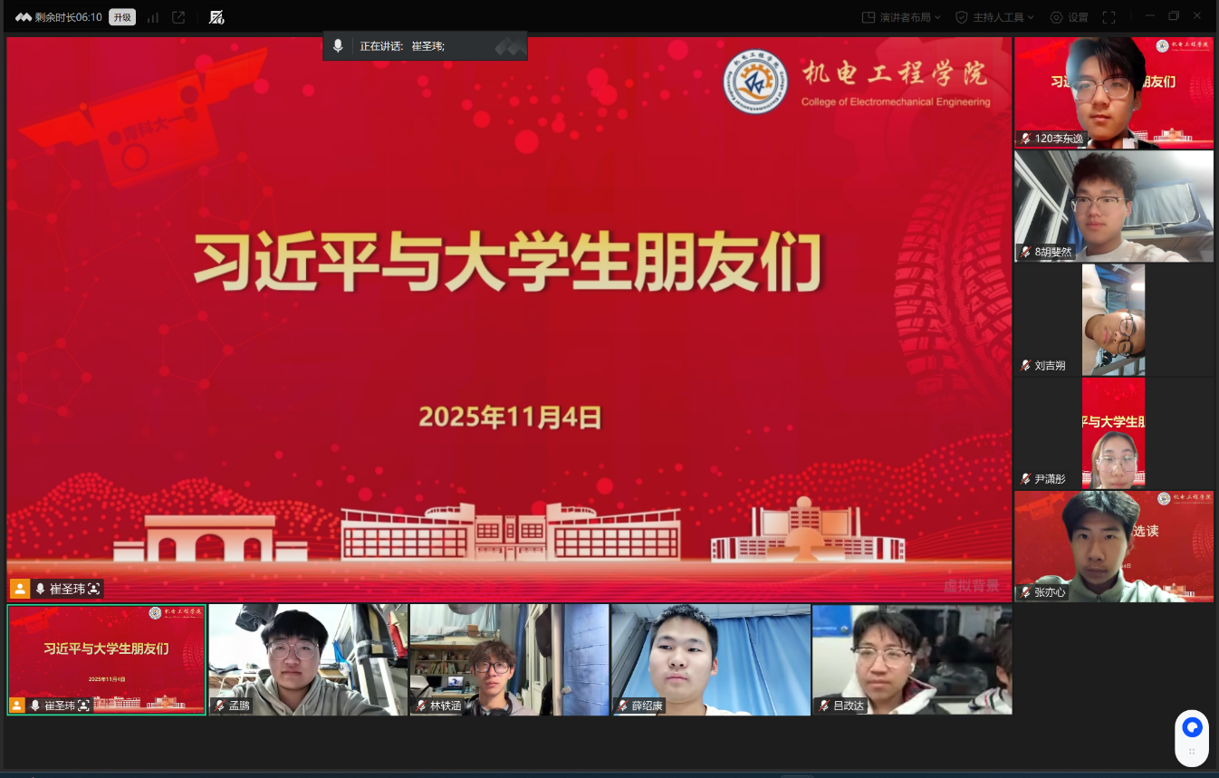 11月4日,机电工程学院开展“书香润机电,聚力谱新篇”读书学习活动,组织学生以读书小组的形式进行线上研读讨论。鼓励同学们结合课程间隙、睡前时段等碎片化时间自主研读,通过线上共享文档同步进度、标注重点、在线研讨。学习过程中,同学们在《习近平与大学生朋友们》收录的访谈实录中汲取成长力量,良好学习氛围悄然而生。