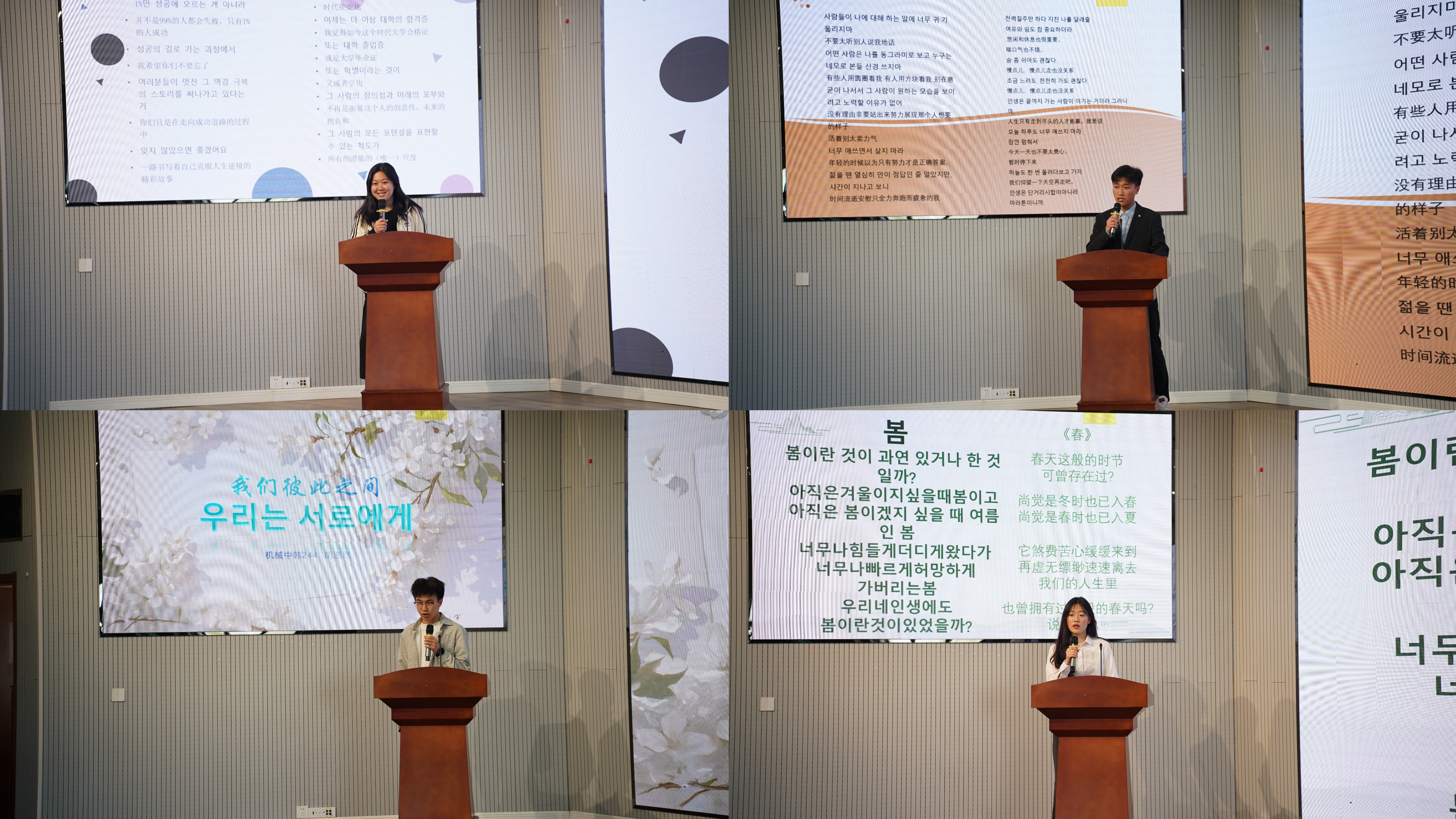 韩韵悠悠耳畔响,诗风缕缕润心田。2025年4月29日下午,机电工程学院成功举办“诵读韩韵,声动人心”第一届韩语朗诵大赛。此次大赛旨在提升学生韩语水平,激发韩语学习兴趣,吸引了机械工程(中韩合作办学)专业、材料成型及控制工程(中韩合作办学)专业学生的广泛参与。机电工程学院副院长李剑光、合作办学办公室主任付平、中韩合作办学师生代表80余人参加此次活动。韩语教师刘雪云、马敏、李静作为本次评委。